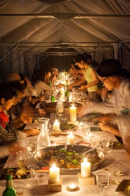 DESIGNEAST05 CAMP in Kyotoはキャンプインセレモニーに始まり、自然発泡のサイダーをつくるワークショップ、集落全体のフィールド調査がまず行われた。実際に集落内を歩くと、その歴史性と同時にかすかな人々の暮らしを感じられた。定期的に週末だけ帰ってくる元村民が農園やお墓、住居の手入れをしているため、集落内の全てが朽ち果てているわけではない。事実、フィールド調査中にも元村民が風呂を湧かしているところを見かけることができた。フィールド調査後には、元小学校校庭に設置された巨大なレーステントの中にダイニングテーブルが用意され、おいしい食べ物 を頂いた。その後、会場を川のそばに移してキャンプファイヤーを囲みながらトークセッションが21時ごろから翌朝6時まで開催された。翌朝は朝食後、雨のなか一休みしてからカレーをつくり、発酵したサイダーを飲んで解散式となった。
